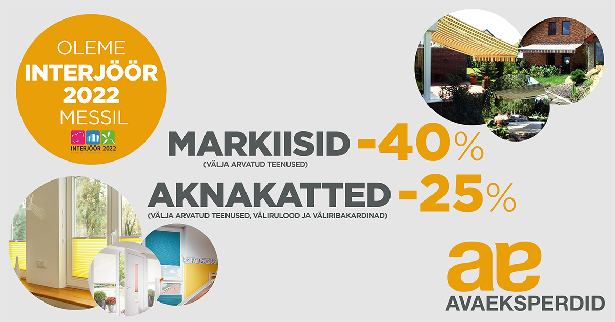 The trade fair Interjöör 2022 will be held at the Eesti Näitused Exhibition Center, at Pirita tee 28, Tallinn. The exhibition center’s opening hours: April 22 from 10 am to 6 pm; April 23 from 10 am to 6 pm; April 24 from 10 am to 5 pm. Visit Avaeksperdid at booth no. 309, and take advantage of our special offers—40% off all awnings and 25% off all window coverings when ordering at the fair (excluding services).